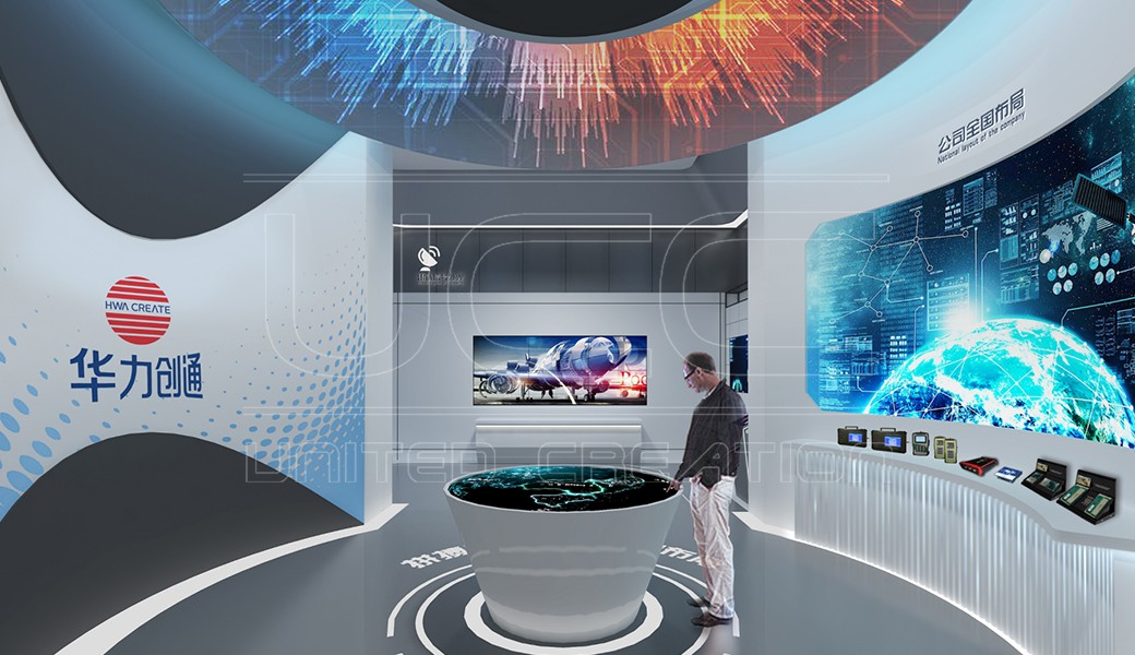 華力創(chuàng)通從事國防、政府及行業(yè)信息化技術(shù)研究與創(chuàng)新應(yīng)用的領(lǐng)先者,企業(yè)展廳不僅要展示出企業(yè)文化、科技成果,更要體現(xiàn)出科技性與引領(lǐng)性,我們在展陳方面體現(xiàn)出華力創(chuàng)通的先進(jìn)性,并著力表達(dá)出“國防援軍,軍民橋梁”的企業(yè)使命。