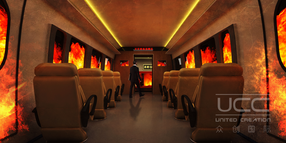 2.背墻手繪畫面,3.投影區(qū)域為需手繪老電影畫面圖案與投影畫面虛化融合,360°沉浸式場景體驗,還原火災現(xiàn)場真實感,失火地鐵列車,